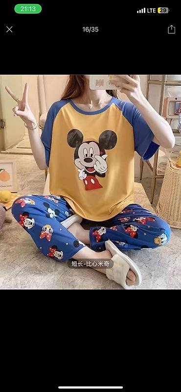 - Футболка свободного кроя с реглан‑рукавами синего цвета и принтом Микки на жёлтом фоне.
