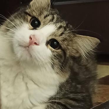 Пушистый домашний кот с выразительной мордочкой и розовым носиком