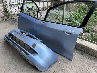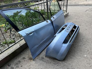 В наличии комплект кузовных деталей для автомобиля Honda Fit. Включает в себя две двери в сборе со стеклами и ручками, а также передний бампер. Цвет деталей – светло -голубой. Двери могут быть использованы для замены поврежденных или изношенных элементов кузова. Бампер также предназначен для установки на переднюю часть автомобиля.