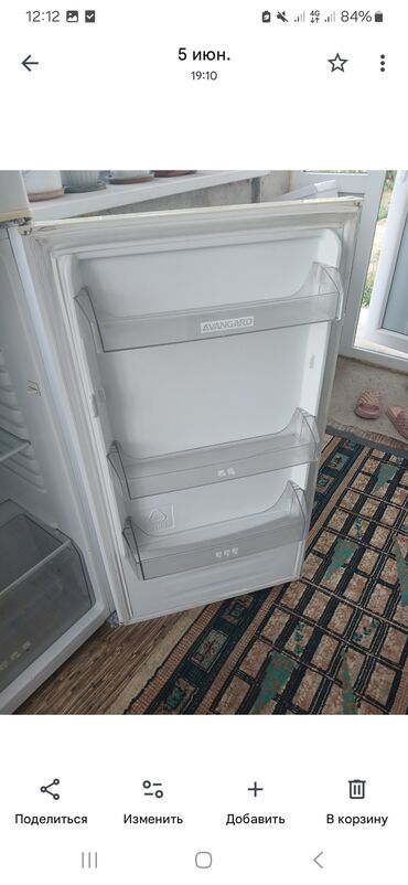 - На двери три широких прозрачных балкона для бутылок и соусов (бренд AVANGARD на среднем балконе).