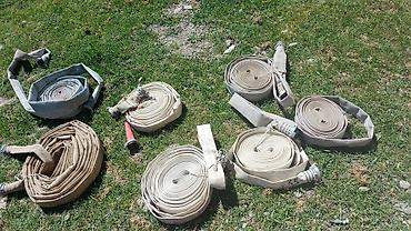 - Дополнительно на фото — несколько напорных рукавов/шлангов пожарного типа с быстроразъёмными головками (разные длины и диаметры), возможны для подключения к насосам/компрессору или как магистрали для подачи воды.