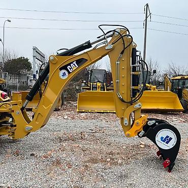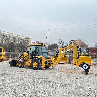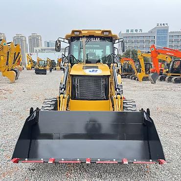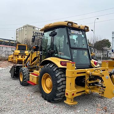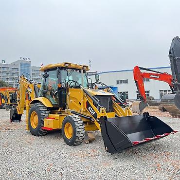 Марка/модель на борту: Caterpillar 430F (CAT). Цвет: жёлтый. Комплектация на фото: фронтальный ковш с зубьями и задний экскаваторный ковш.