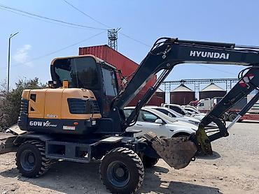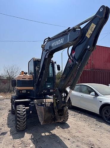 Колёсный экскаватор Hyundai (серия H) с фронтальным ковшом. Основные характеристики: - Колёсная база: 4x4, дорожные шины для работы на стройплощадках и в городе. - Гидравлическая стрела с мощными ...