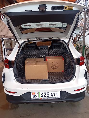 Электрокроссовер JAC Sehol E40X (надписи на кузове: “E40X”, “EV 600T”). Кузов — белый, 5‑дверный, номерные знаки KG. Современный дизайн с узкой светодиодной оптикой, Т‑образными ДХО, сплошной задней световой линией и аэродинамическими колесными дисками.