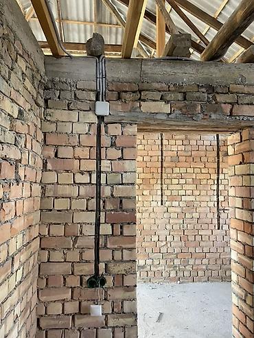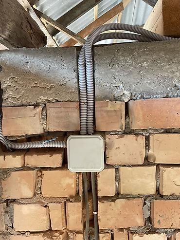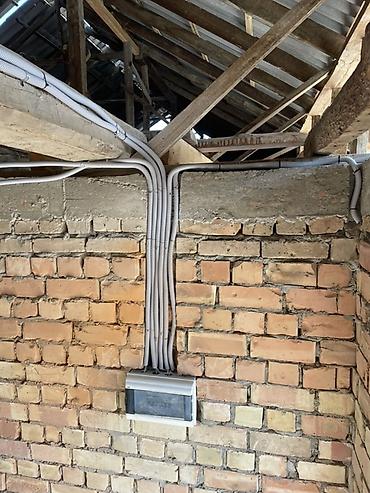 - Выполнена новая скрыто-открытая проводка по кирпичным стенам и деревянным балкам в гофрированной ПВХ-трубе.