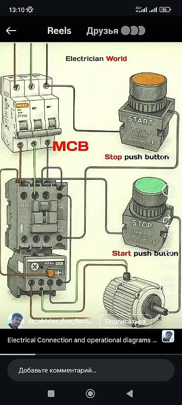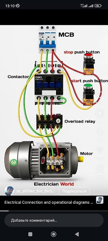 - Подключение электродвигателей через тепловое реле, автоматический выключатель и кнопочные посты
