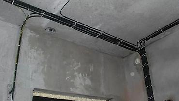 - Прокладка кабелей по потолку и стенам: в штробах или открыто (в гофре/трубе/клипсах), аккуратная укладка трасс и фиксация