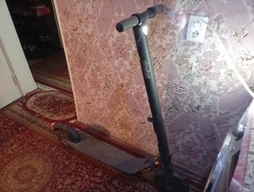 Электрический самокат черного цвета с широкими колесами, сиденьем и двойными задними амортизаторами. Модель оснащена фарой, зеркалами заднего вида и дисковыми тормозами, обеспечивающими безопасност...