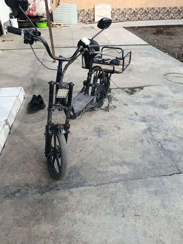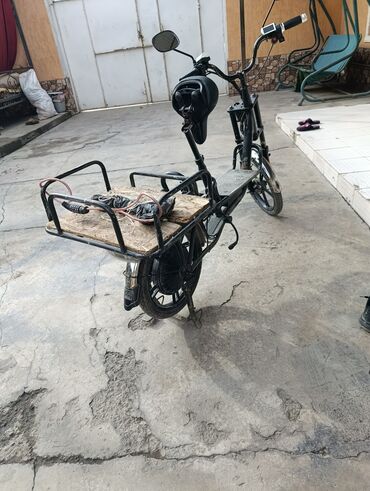 Электровелосипед/электроскутер с грузовыми багажниками Описание: - Компактный городской электровелосипед с низкой рамой и площадкой для ног. - Два усиленных багажника: передняя корзина из пластика...