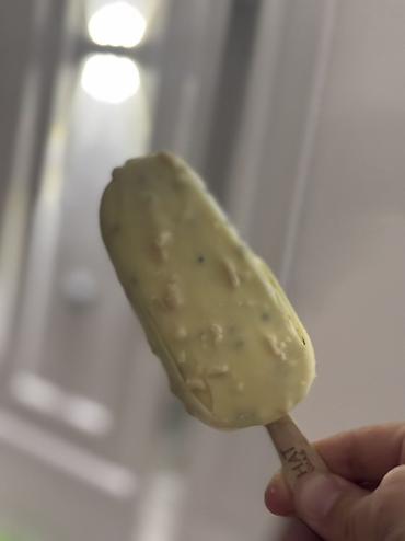 - Консистенция: плотное сливочное мороженое, равномерно покрытое толстой глазурью с кусочками.