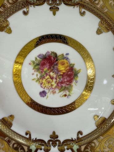 64 Персон Фарфоровая столовая тарелка с богатым декором и цветочным медальоном.