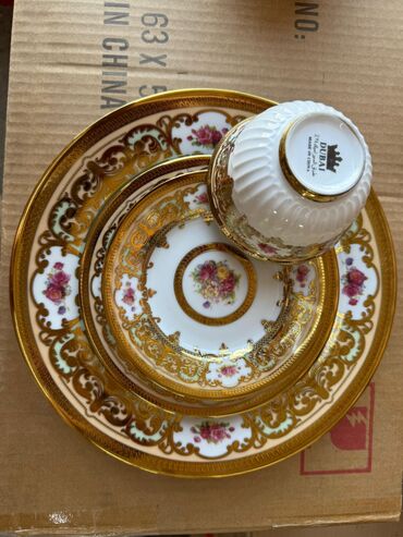 - Край: широкий золочёный кант с рельефным узором, гладкая глянцевая глазурь.