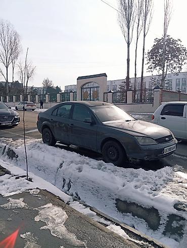 Ford Mondeo седан, темно‑серый цвет. Кузов 4‑дверный, просторный салон с широкими дверными проёмами. Передняя оптика с линзами, противотуманные фары в бампере. Задние фонари треугольной формы, большой багажник с низкой погрузочной кромкой. Колёсные арки под 16" диски; установлены стальные диски с колпаками. Зеркала и ручки дверей в цвет кузова, антенный модуль на крыше. Передний и задний бамперы с площадками под датчики/противотуманки, центральная решётка радиатора с эмблемой Ford. Номерные знаки KG. Отличается мягкой подвеской, хорошей шумоизоляцией и вместительным багажником — практичный семейный седан с комфортной посадкой и устойчивостью на трассе.