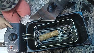 - Настольная электрическая фритюрница с металлическим корпусом и съёмной крышкой с ручкой.