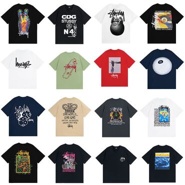 - Принты: фирменные логотипы Stüssy, типографика, абстрактные и уличные иллюстрации, тематические графики (peace, города, игральные кости, глобус и др.)