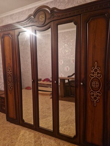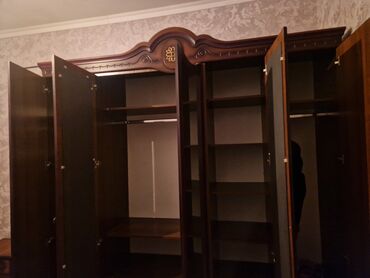 - Трёхсекционный платяной шкаф из тёмного дерева с резным карнизом и декором. Внутри: два отделения с перекладинами для вешалок, верхние полки, нижние полки/тумбы; центральная секция — многоуровневые открытые полки для белья и хранения. Распашные двери на петлях, металлическая фурнитура.