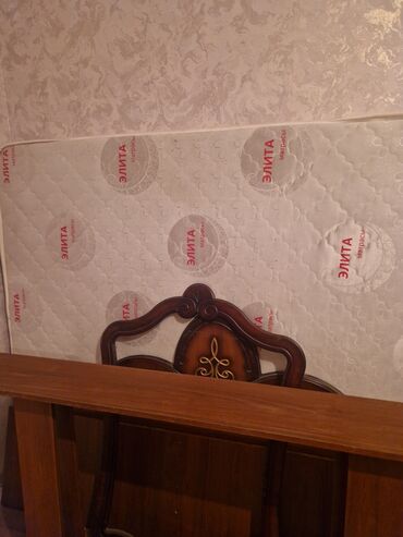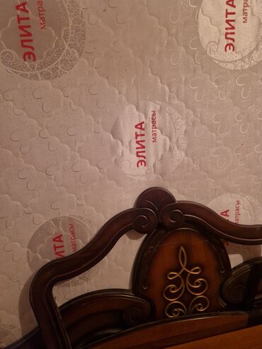 - Двуспальная кровать с фигурным изголовьем и изножьем, резные элементы и вставки под орех. Матрас «Элита» (на фото — чехол/бренд «Элита матрасы»).