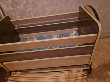 - Детская кроватка маятникового типа из ЛДСП в комбинации светлых и тёмных древесных тонов. Высокие бортики, основание под матрас на ламелях (ламели на фото в комплекте), мягкий матрасик/подушка внутри.