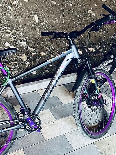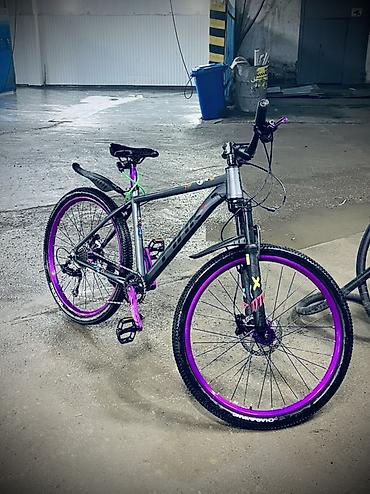 - Колёса: 27.5", анодированные фиолетовые обода, покрышки среднего протектора для грунта и асфальта