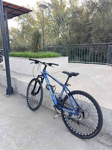 Горный велосипед Adidas (MTB), с амортизационной вилкой и прочной алюминиевой рамой синего цвета. Подходит для городских поездок и легкого бездорожья.
