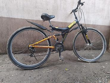 Горный велосипед с амортизатором - Рама: стальная, двухподвес (передняя вилка с ходом и центральный амортизатор на раме) - Колёса: 26", зубастые покрышки для грунта - Тормоза: ободные V‑brake ...