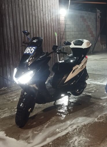 Скутер/мопед 50–150 см³ (точная модель не указана), черный, с доработками для повседневной езды и доставки. Особенности и комплектация: - Аэродинамичная передняя облицовка, двухсекционные фары бли...