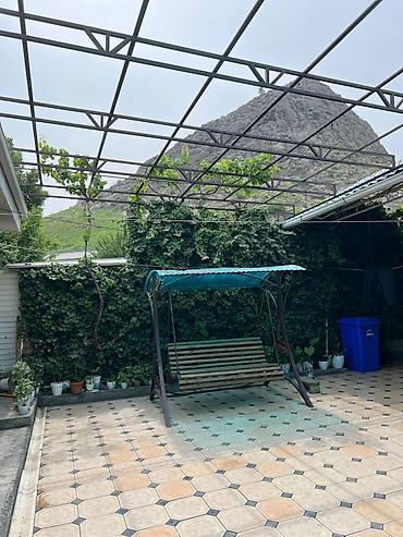 - Уютный внутренний двор с мощёной площадкой, навесом из поликарбоната и кованными перилами. Есть садовые качели, озеленение, виноградная лоза, место для отдыха на свежем воздухе.