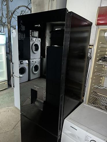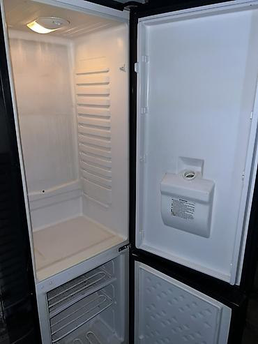 - Внутри: верхняя холодильная камера с полками и боковыми направляющими под установки полок/балконов; нижняя морозильная камера с проволочными корзинами