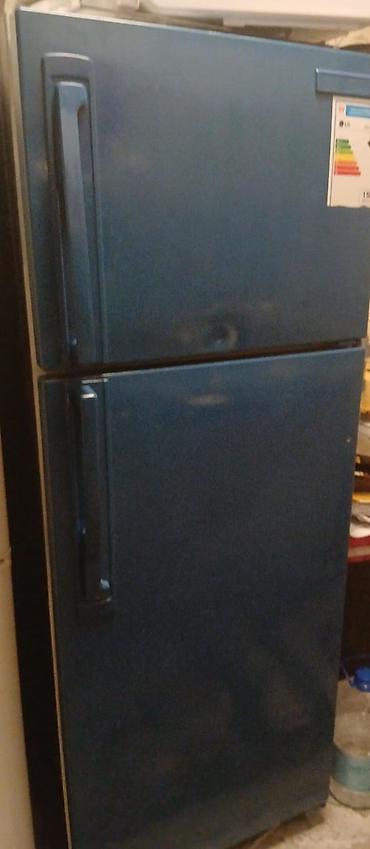 Холодильник двухкамерный, классическая компоновка: сверху морозильная камера, снизу холодильное отделение. Цвет фасада — синий, ручки вертикальные на обеих дверцах, отдельные двери для каждой камеры. Механическое управление температурой, наклейка с энергетической шкалой на верхней двери. Стандартная ширина корпуса, подходит для кухни или дачи. Корпус металлический, двери с уплотнителями по периметру. Работает от обычной розетки 220 В. Подойдет для хранения продуктов и заморозки полуфабрикатов, овощей и мяса.
