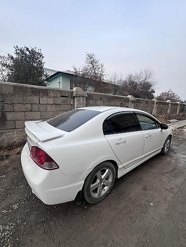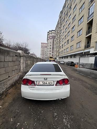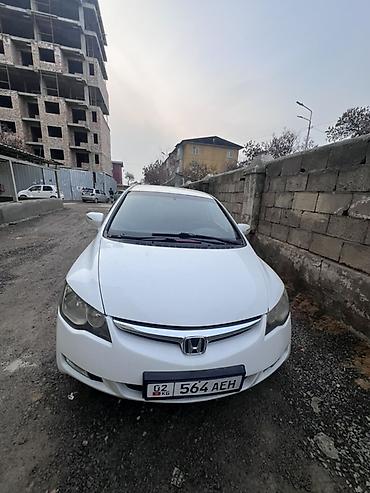 Honda Civic седан, серебристый цвет, кузов 4‑дверный (поколение 8). Номерные знаки KG. Легкосплавные диски, штатная оптика, галогеновые фары. Зеркала и ручки в цвет кузова, бампера с интегрированны...