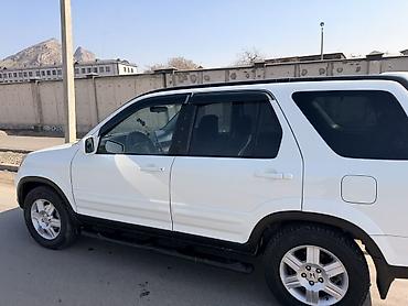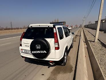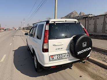 Honda CR‑V, 2-е поколение, белый кузов. Пятидверный кроссовер с запасным колесом на задней двери (чехол HONDA), продольными рейлингами на крыше и боковыми подножками. Литые диски, всесезонные шины. Передняя оптика с прозрачными рассеивателями, противотуманные фары в бампере. Задние вертикальные фонари, стеклоочиститель двери багажника, фаркоп. Тонированные стекла, зеркала и ручки в цвет кузова, молдинги порогов.
