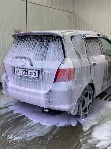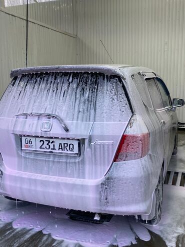Honda Jazz (на киргизских номерах 06 KG, номер на фото). Серебристый 5‑дверный хэтчбек.