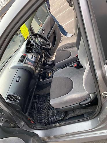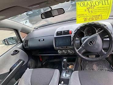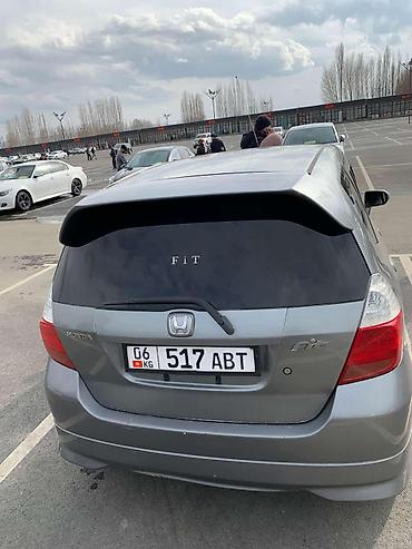 Практичный городской автомобиль с экономичным мотором, удобным высоким салоном и большим багажным отсеком при сложенных сиденьях. Номер модели и маркировка Fit на крышке багажника, регистрационные номера KG. На лобовом стекле размещено объявление “Продаю”, указаны параметры: год 2003, объём 1.3, АКПП, передний привод.