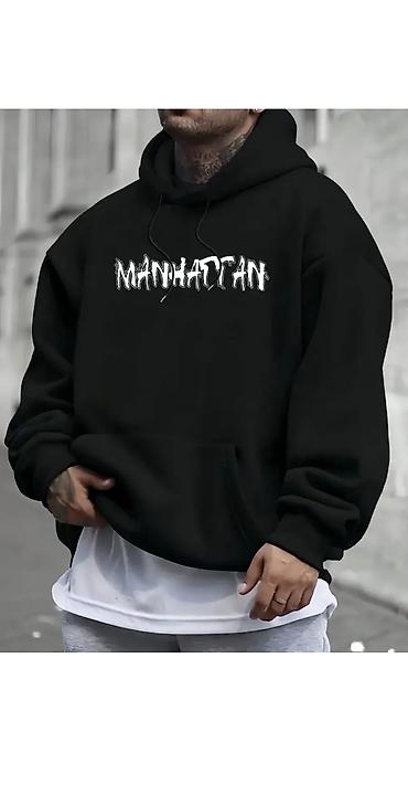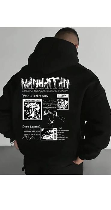 - Принт: спереди крупная надпись “MANHATTAN”; на спине — композиция из графики и текста в контрастном белом цвете (темы: San Francisco, Telepathy, Dark Legends и др.).