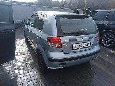 Hyundai Getz, 5‑дверный хэтчбек, серебристый цвет кузова. Компактные габариты, удобен для города и парковки. Задняя дверь багажника с большим проёмом, практичные неокрашенные молдинги и бамперы для защиты от царапин. Тонированные стекла, повторители поворота на крыльях, передние противотуманные фары. Черные штампованные диски, полноразмерная запаска предполагается в нише багажника. Задние сиденья складываются, увеличивая полезный объём багажника. В салоне — тканевые сиденья, эргономичная передняя панель, кондиционер и базовая аудиосистема (по комплектации модели). Экономичный бензиновый двигатель, передний привод, механическая коробка передач (типично для этой версии). Отличный городской автомобиль: манёвренный, экономичный, с практичным салоном и удобной погрузкой. Номер модели и эмблемы Hyundai/Getz на крышке багажника. Регистрационные номера формата KG. 1,6обьем, чириги жок