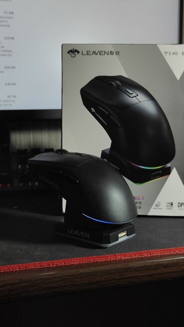 Комплект на фото: мышь LEAVEN X3 LIGHT, док-станция/приёмник. Маркировки на коробке: 2.4G, DPI, Dual mode gaming mouse. Отлично подходит для игр и повседневной работы.
