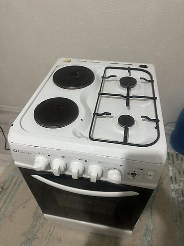 - Варочная поверхность: 2 электрические конфорки + 2 газовые горелки (решётка из металла).