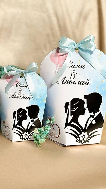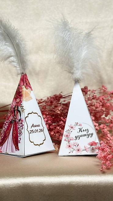 - Пирамидальные коробочки с пером для «Кыз узату» — с цветочным принтом и местом для имени и даты (например: «Аяна 25.01.26»). Подходят для сладостей и небольших подарков гостям.