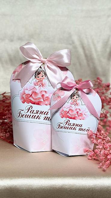 - Подарочные коробочки с атласными бантами для «Бешик той» — два размера, иллюстрация девочки в платье, нежные розово-белые оттенки.