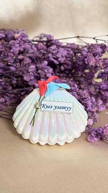 - Жемчужно‑перламутровая шкатулка в форме ракушки с табличкой «Кыз узату» и декоративными цветами.
