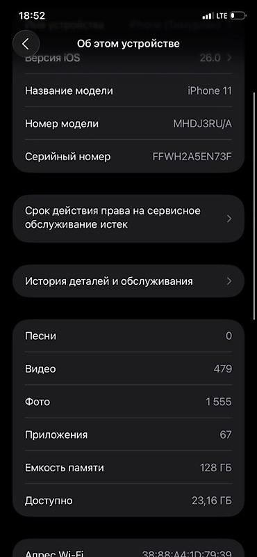 IPhone 11, белый - Память: 128 ГБ (доступно ~84,87 ГБ на момент фото) - Модель: MWM22KH/A - iOS: 18.2 - Экран: Liquid Retina, True Tone, поддержка Night Shift, тёмная тема - Камеры: двойная основ...