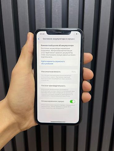 - Аккумулятор: максимальная ёмкость 73% (на экране «Состояние аккумулятора» есть уведомление о необходимости сервисной замены); оптимизированная зарядка включена