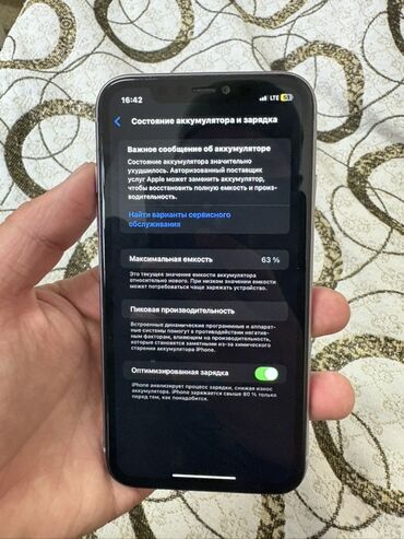 - Аккумулятор: максимальная ёмкость 63% (в разделе «Состояние аккумулятора и зарядка» отображается уведомление о необходимости сервиса).