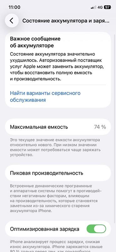 - Состояние аккумулятора по iOS: максимальная емкость 74% (на экране показано системное уведомление о необходимости замены для восстановления полной емкости)