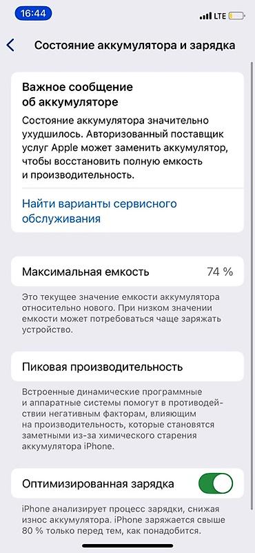 Состояние аккумулятора по настройкам: максимальная ёмкость 74%, в разделе «Состояние аккумулятора» отображается важное сообщение о необходимости обслуживания (рекомендуется замена для восстановления полной автономности).