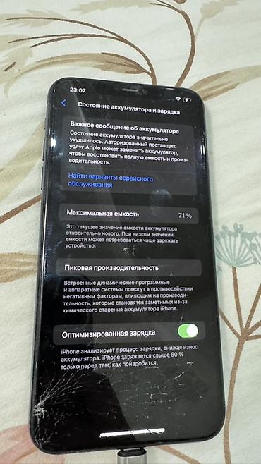 Состояние аккумулятора по меню: максимальная ёмкость 71%. На экране включена функция «Оптимизированная зарядка». На дисплее имеются видимые трещины в нижнем левом углу и по поверхности (см. фото). Корпус Space Gray с незначительными следами эксплуатации, блок камер визуально цел, защитные кольца на объективах.