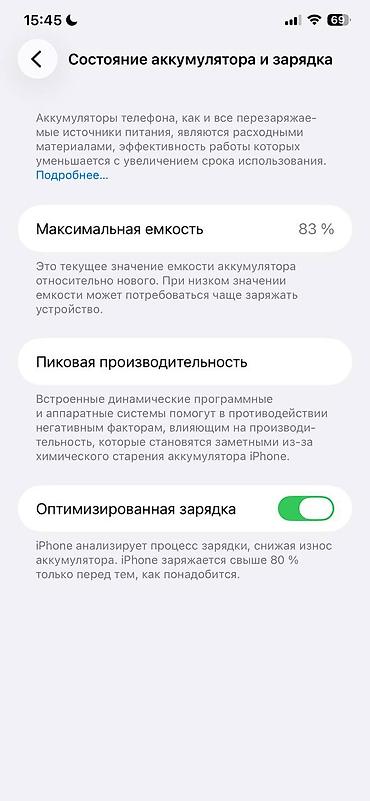 - Аккумулятор: максимальная ёмкость 83%, включена функция «Оптимизированная зарядка»