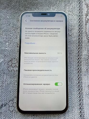 - Состояние аккумулятора в настройках указано как 90% максимальной ёмкости; отображается сообщение о невозможности проверить подлинность аккумулятора. Оптимизированная зарядка включена