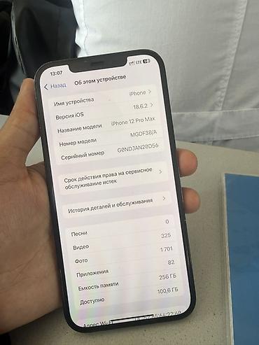 IPhone 12 Pro Max 256 ГБ. АКБ:87% Характеристики: - Модель: iPhone 12 Pro Max (номер модели MGCM3LL/A) - Цвет корпуса: светлый (серебристый/белый) - Память: 256 ГБ, доступно около 237,65 ГБ - iOS:...