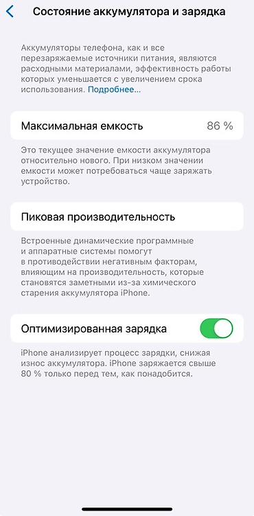 - Аккумулятор: максимальная ёмкость 86%, активна «Оптимизированная зарядка»